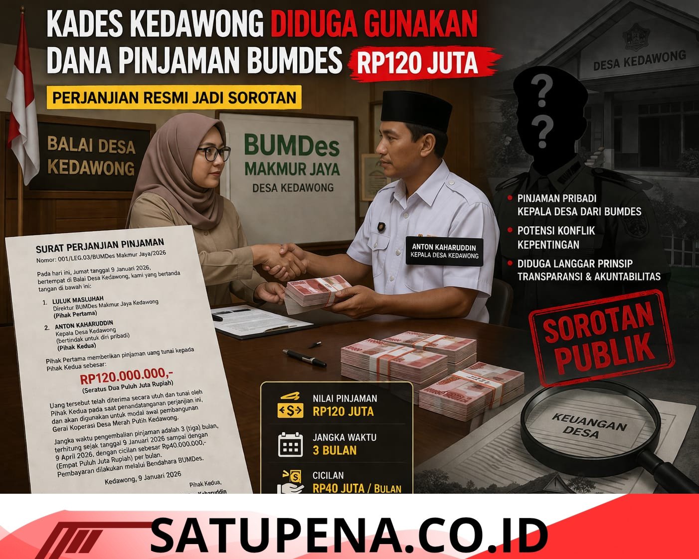 Jombang,satupena.co.id– Sebuah dokumen Surat Perjanjian Pinjaman bernomor 001/LEG.03/BUMDes Makmur Jaya/2026 mengungkap adanya transaksi pinjaman uang senilai Rp120 juta antara Direktur BUMDes Makmur Jaya Kedawong dengan Kepala Desa Kedawong, Anton Kaharuddin.