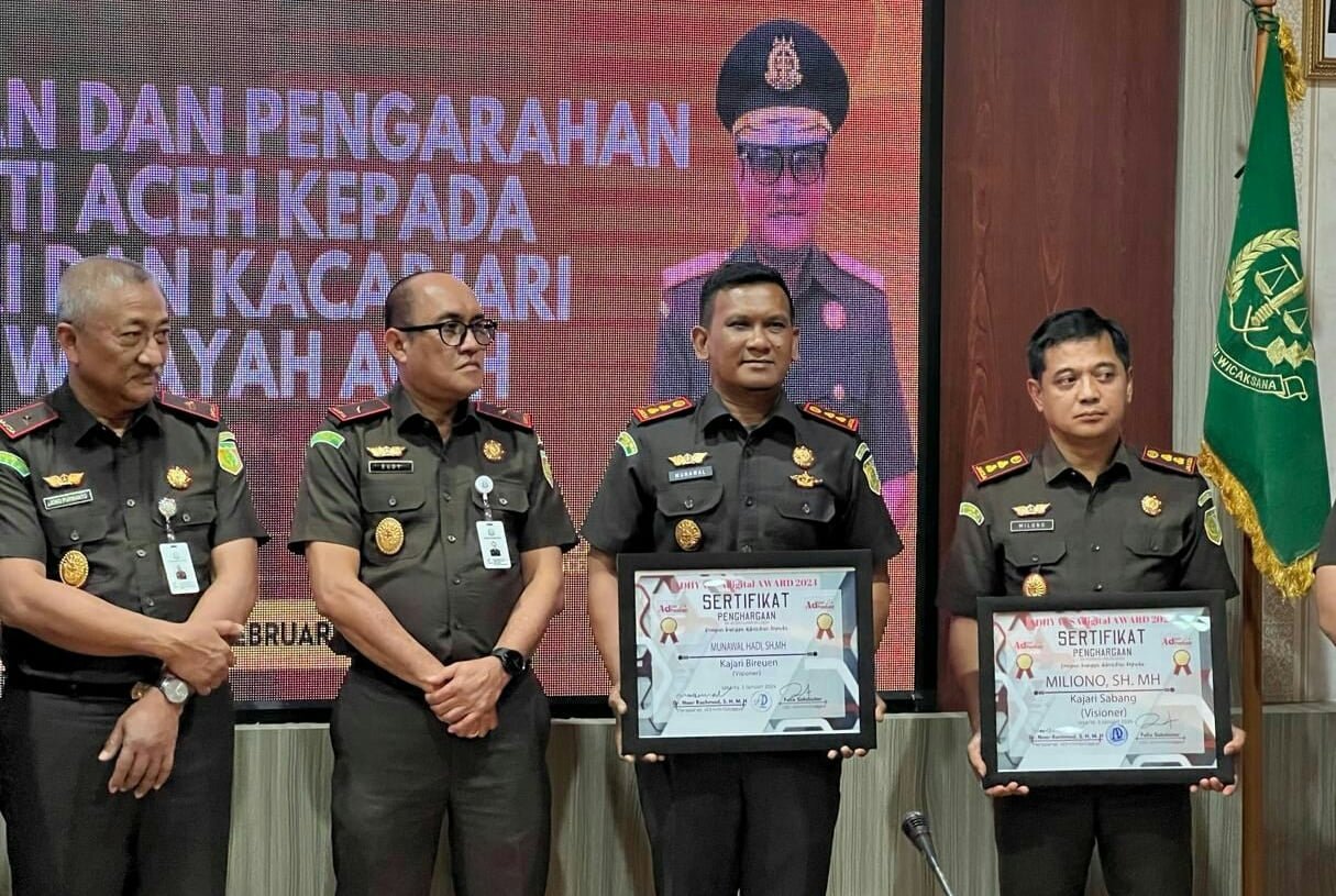 Penghargaan yang diterima Kajari diserahkan langsung oleh CEO ADHYAKSAdigital Felix Sidabutar bertempat di Aula Kejaksaan Tinggi Aceh di Banda Aceh.