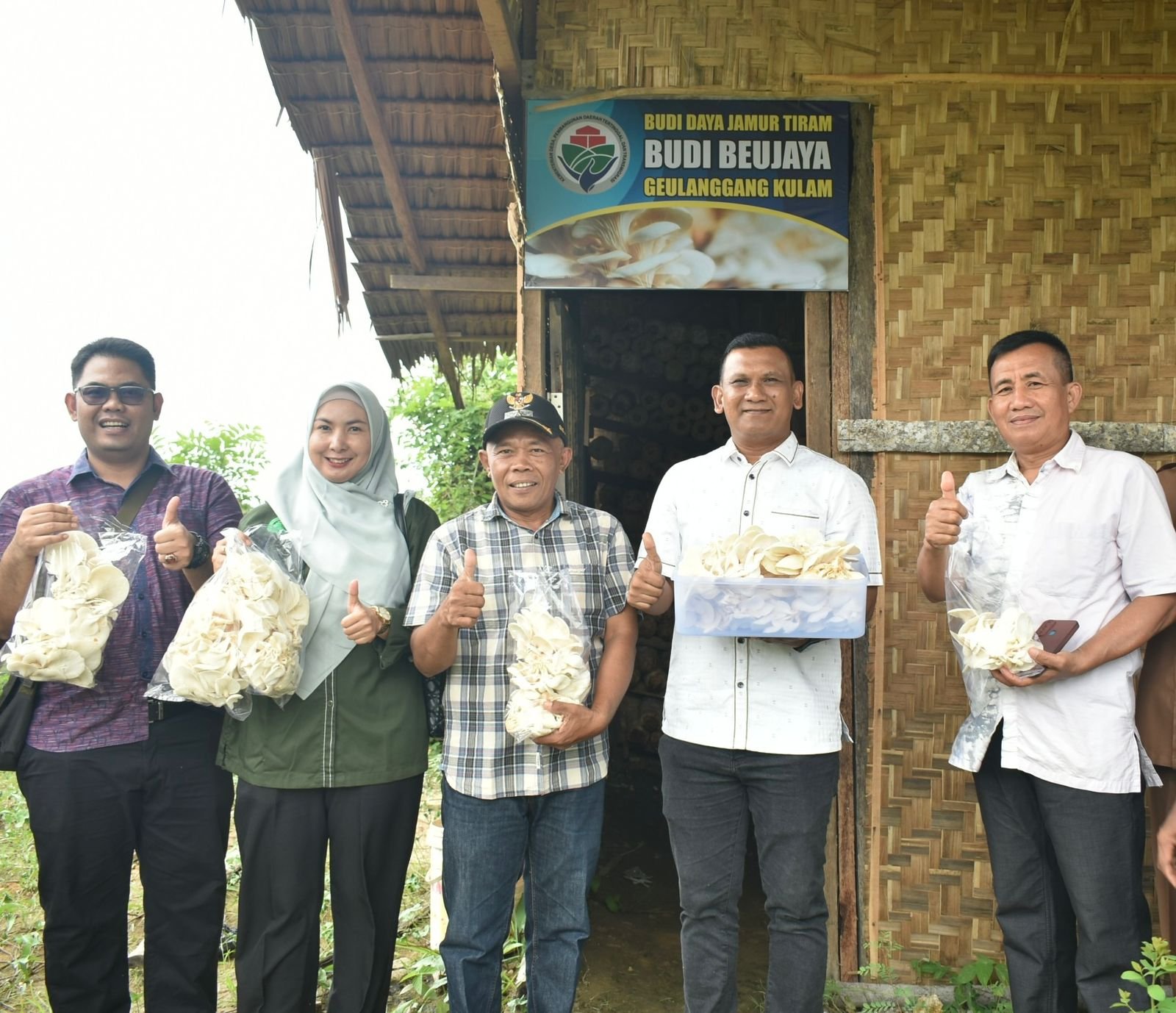 Kajari Bireuen Munawal Hadi, S.H.,M.H didampingi Kasi Intel Abdi Fikri, S.H.,M.H, hadir bersama pada acara panen jamur tersebut, beserta Keuchik (Kepala Desa) Geulanggang Kulam an. Amri, Pihak Kecamatan, Pendamping Desa dan Pendamping Lokal Desa, Kelompok Masyarakat Petani Budidaya jamur tiram serta masyarakat setempat.