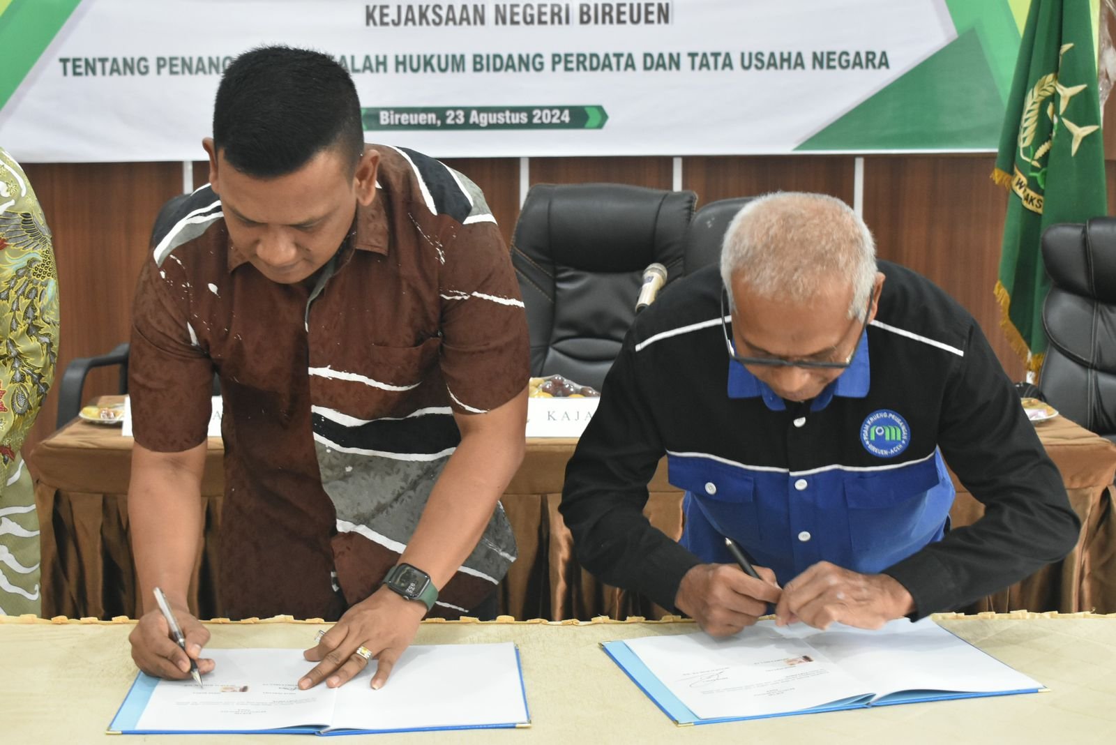Kepala Kejaksaan Negeri Bireuen Munawal Hadi, S.H.,M.H menyampaikan adapun MoU ini bertujuan untuk merumuskan langkah-langkah dalam melakukan kegiatan terkait bidang hukum Perdata dan Tata Usaha Negara antara Perusahaan Daerah Air Minum (PDAM) dengan Kejaksaan Negeri Bireuen selaku Jaksa Pengacara Negara yang meliputi kegiatan Bantuan Hukum, Pertimbangan Hukum, Pelayanan hukum dan Tindakan Hukum lainnya.