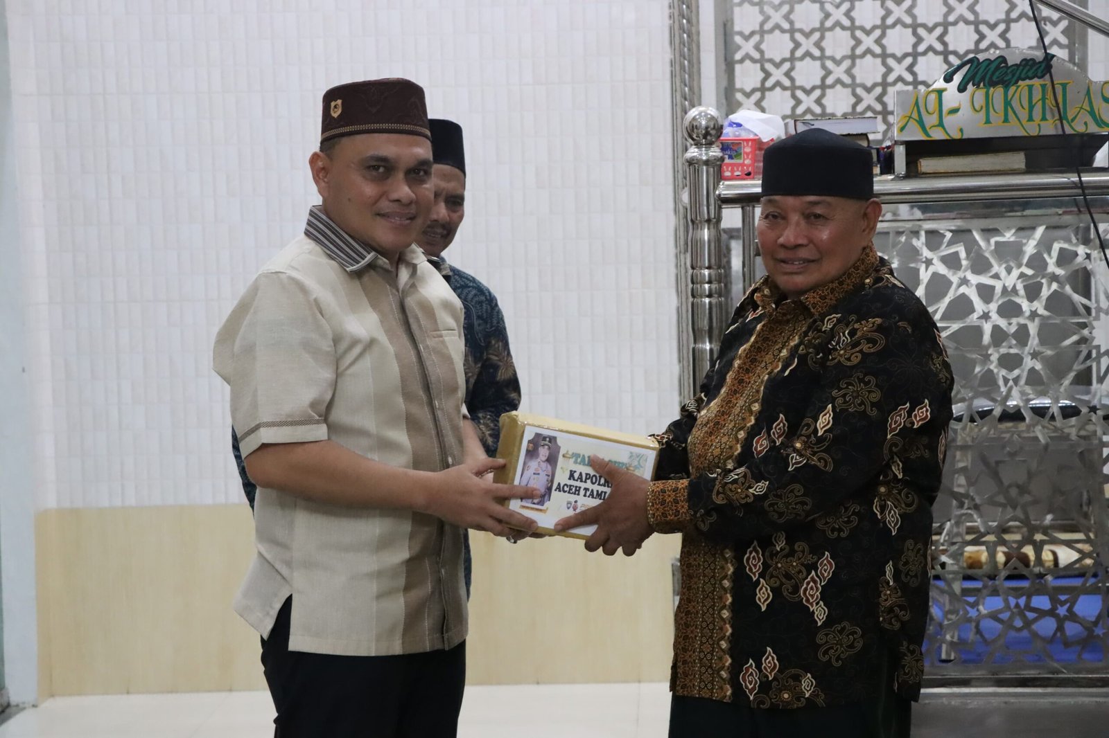 Pada kesempatan ini, Kapolres Aceh Tamiang juga menyerahkan bantuan berupa 5 buah Al – Qur’an kepada BKM mesjid Al ikhlas yang dapat di pergunakan oleh masyarakat untuk beribadah .