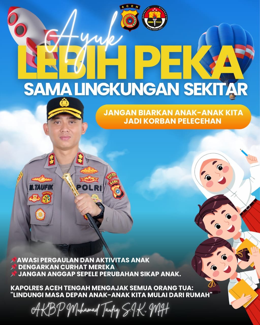 Dalam upaya mencegah tindak kekerasan dan pelecehan terhadap anak, Kapolres Aceh Tengah AKBP Muhamad Taufiq, S.I.K., M.H., mengajak seluruh orang tua untuk lebih peduli dan aktif dalam melindungi anak-anak, dimulai dari lingkungan terkecil, yaitu keluarga.
