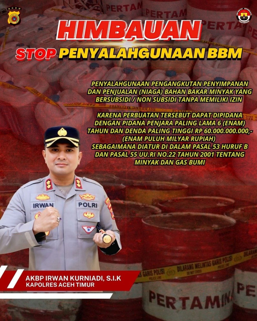 Kepala Kepolisian Resor (Kapolres) Aceh Timur AKBP Irwan Kurniadi, S.I.K. mengingatkan masyarakat agar tidak melakukan praktik penyalahgunaan Bahan Bakar Minyak (BBM) baik subsidi maupun non-subsidi.