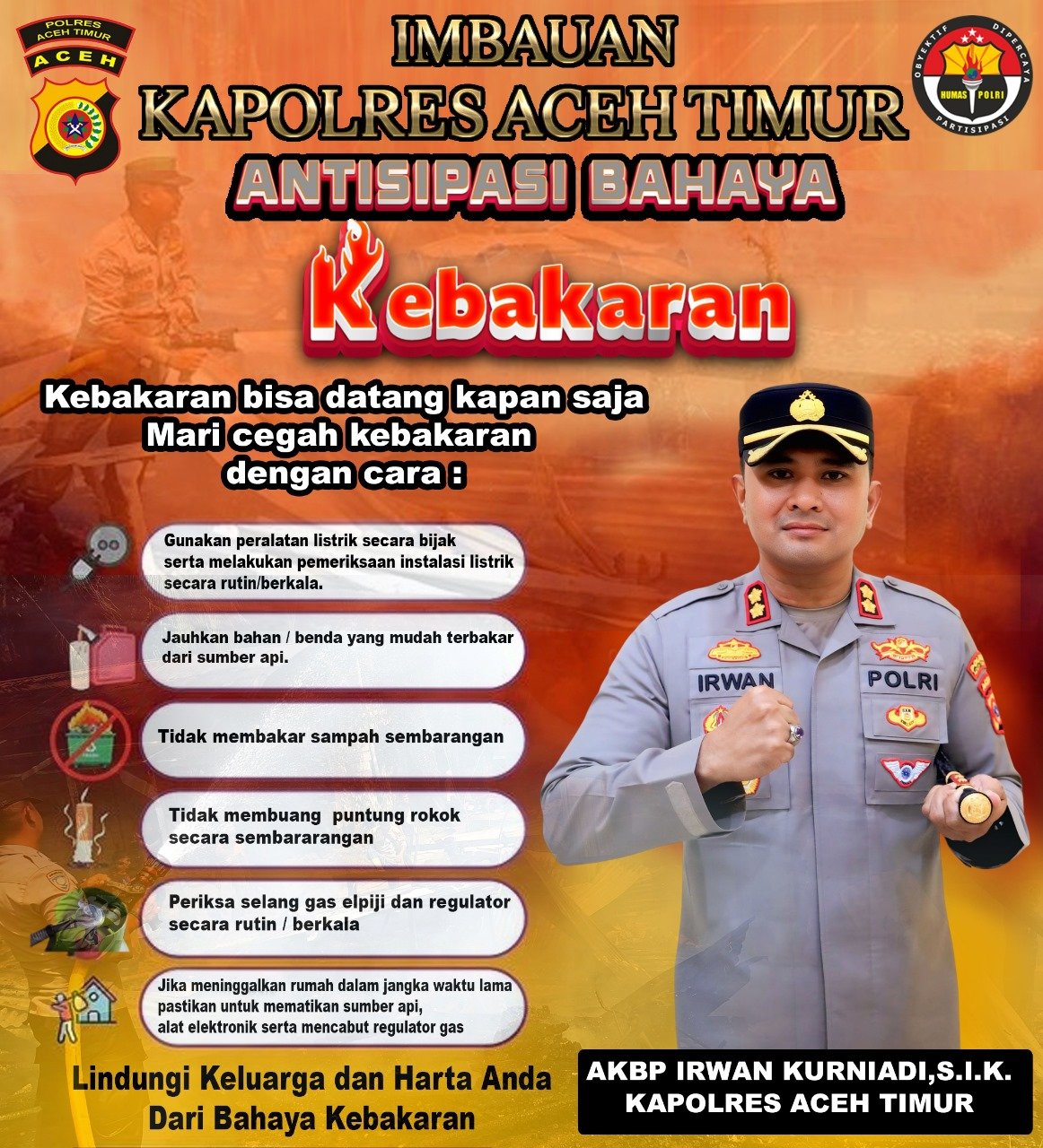 Aceh Timur, Satupena.co.id. – Menyikapi maraknya peristiwa kebakaran rumah yang terjadi belakangan ini, Kapolres Aceh Timur AKBP Irwan Kurniadi, S.I.K. mengeluarkan imbauan kepada masyarakat untuk meningkatkan kewaspadaan dan melakukan langkah antisipatif terhadap potensi kebakaran, terlebih di musim kemarau yang rawan seperti saat ini.