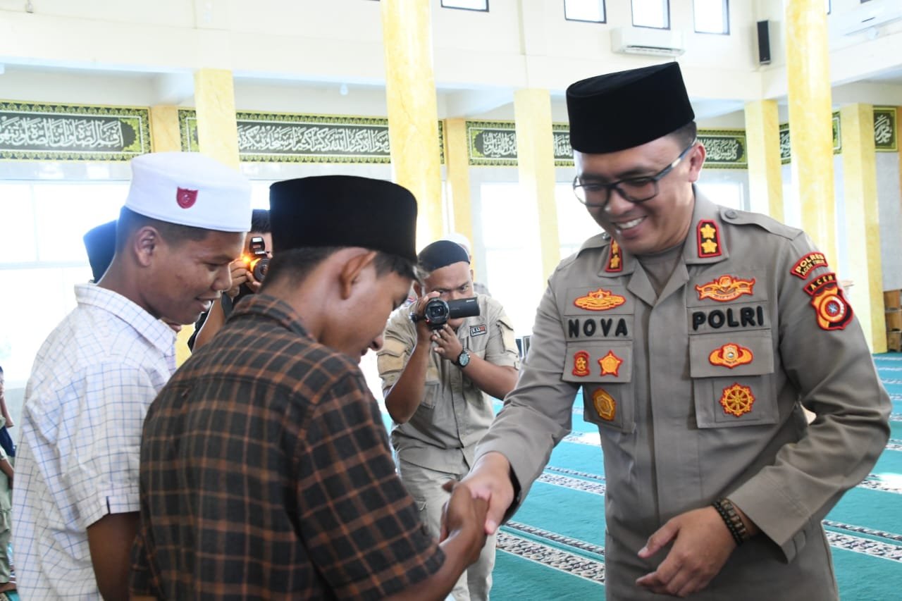 Aceh Timur, SatuPena.co.id, Kapolres Aceh Timur, Polda Aceh, AKBP Nova Suryandaru, S.I.K., didampingi Wakapolres Kompol Iswar, S.H., serta sejumlah pejabat utama, menggelar kegiatan santunan kepada 25 anak yatim di Masjid Babuttaqwa Polres Aceh Timur pada Jumat (7/3/2025) sore.