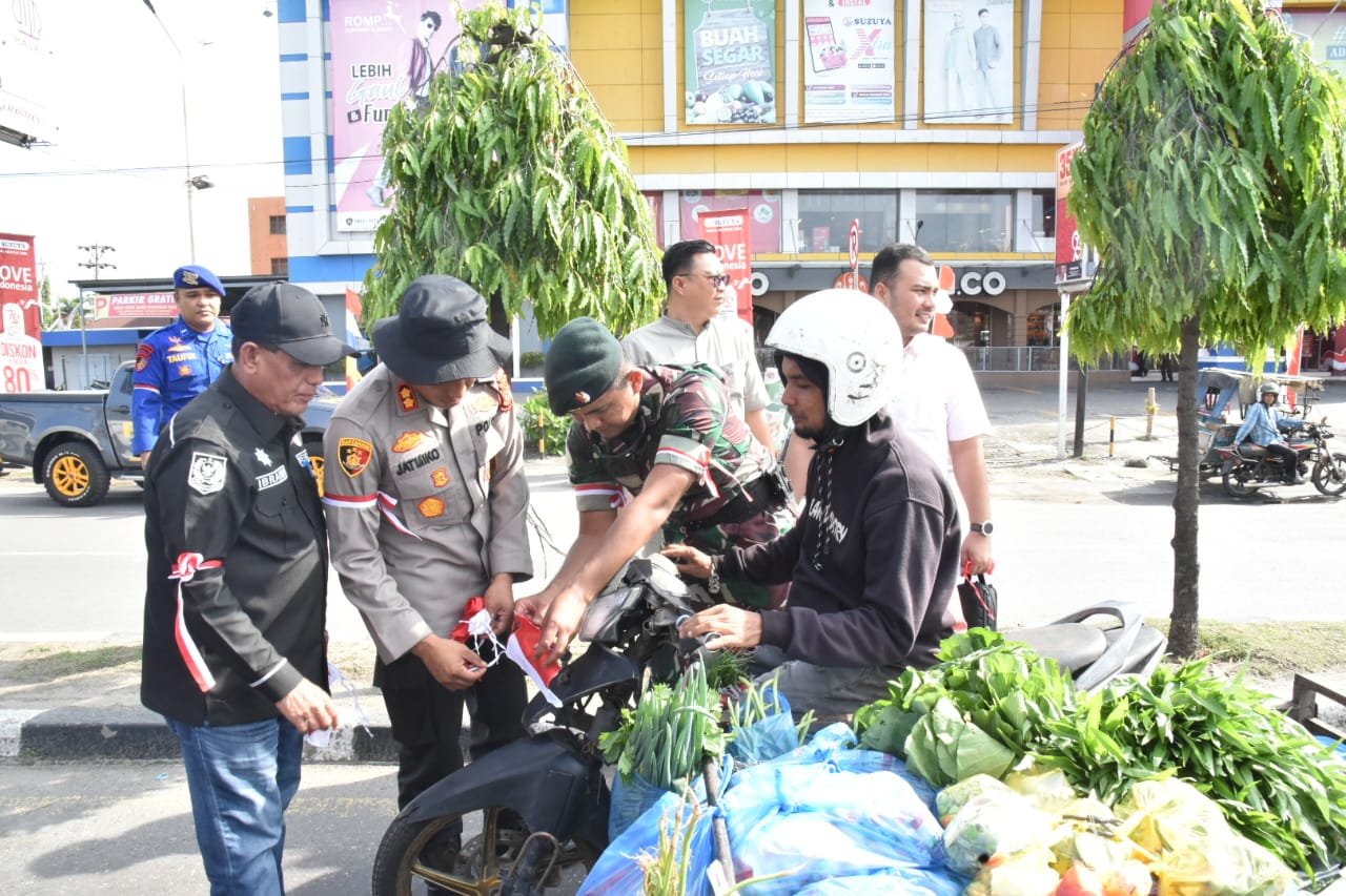 Bireuen -satupena.co.id: Kapolres Bireuen AKBP Jatmiko, S.H., M.H., didampingi Sekda Kabupaten Bireuen, Ir Ibrahim Ahmad, M.Si., Asisten I, Kasat Lantas dan personil Gabungan TNI – Polri, Bagi – bagi bendera Merah Putih kepengendara