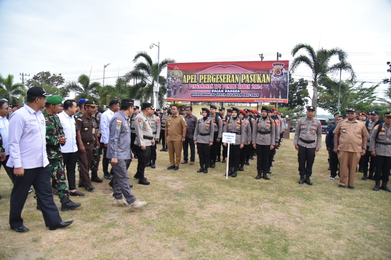 AKBP Jatmiko, mengatakan, Apel Pergeseran Pasukan tersebut merupakan bentuk Kesiapan Personil yang akan melaksanakan Pengamanan terhadap 1.361 TPS yang tersebar di 609 Desa di 17 Kecamatan dalam Wilayah Kabupaten Bireuen