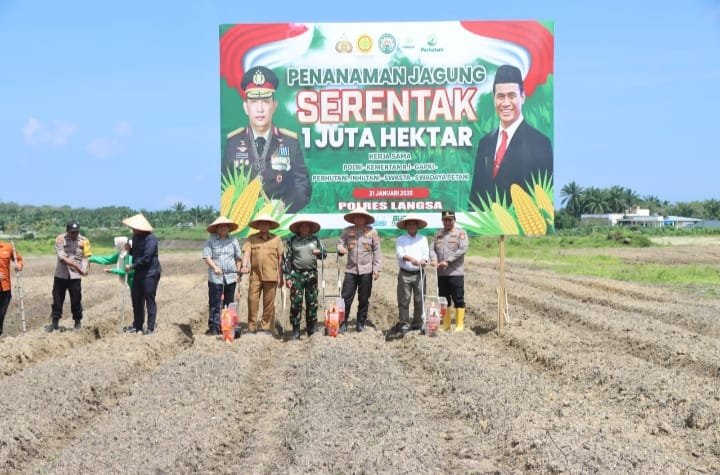 Kapolres Langsa AKBP Andy Rahmansyah, S.I.K., S.H., M.H., memimpin kegiatan penanaman jagung serentak di Desa Meurandeh Teungoh Kecamatan Langsa Lama, Kota Langsa, Selasa (21/1/2024). Kegiatan ini merupakan bagian dari program Penanaman Jagung Serentak 1 Juta Hektar yang digagas oleh Polri bekerja sama dengan Kementerian Pertanian RI, GAPKI, Perhutani, Inhutani, sektor swasta, serta didukung oleh swadaya para petani.