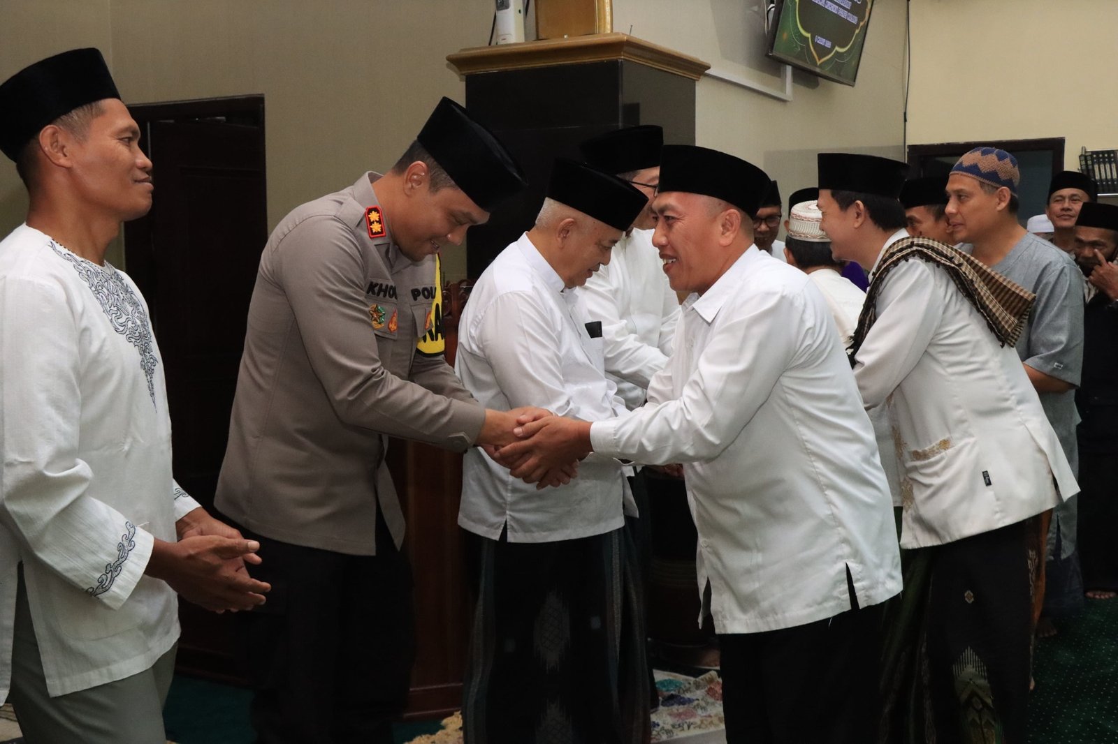 satupena.co.id: Kapolres Malang, AKBP Putu Kholis Aryana, bersama Forum Koordinasi Pimpinan Daerah (Forkopimda) Kabupaten Malang, menggelar kegiatan safari salat Subuh berjamaah keliling (Suling) di Masjid Ashumul Muhsinin, Polres Malang, Jumat (8/12/2023).