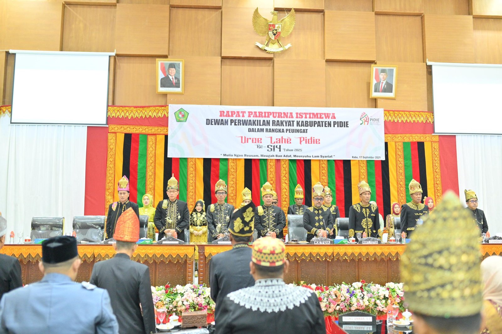 Sigli – Kapolres Pidie AKBP Jaka Mulyana, SIK, MIK bersama jajaran Forkopimda Pidie menghadiri Rapat Paripurna Istimewa DPRK Pidie dalam rangka memperingati Uroe Lahe Pidie ke-514 Tahun 2025, di Gedung DPRK Pidie, Rabu (17/9/2025)