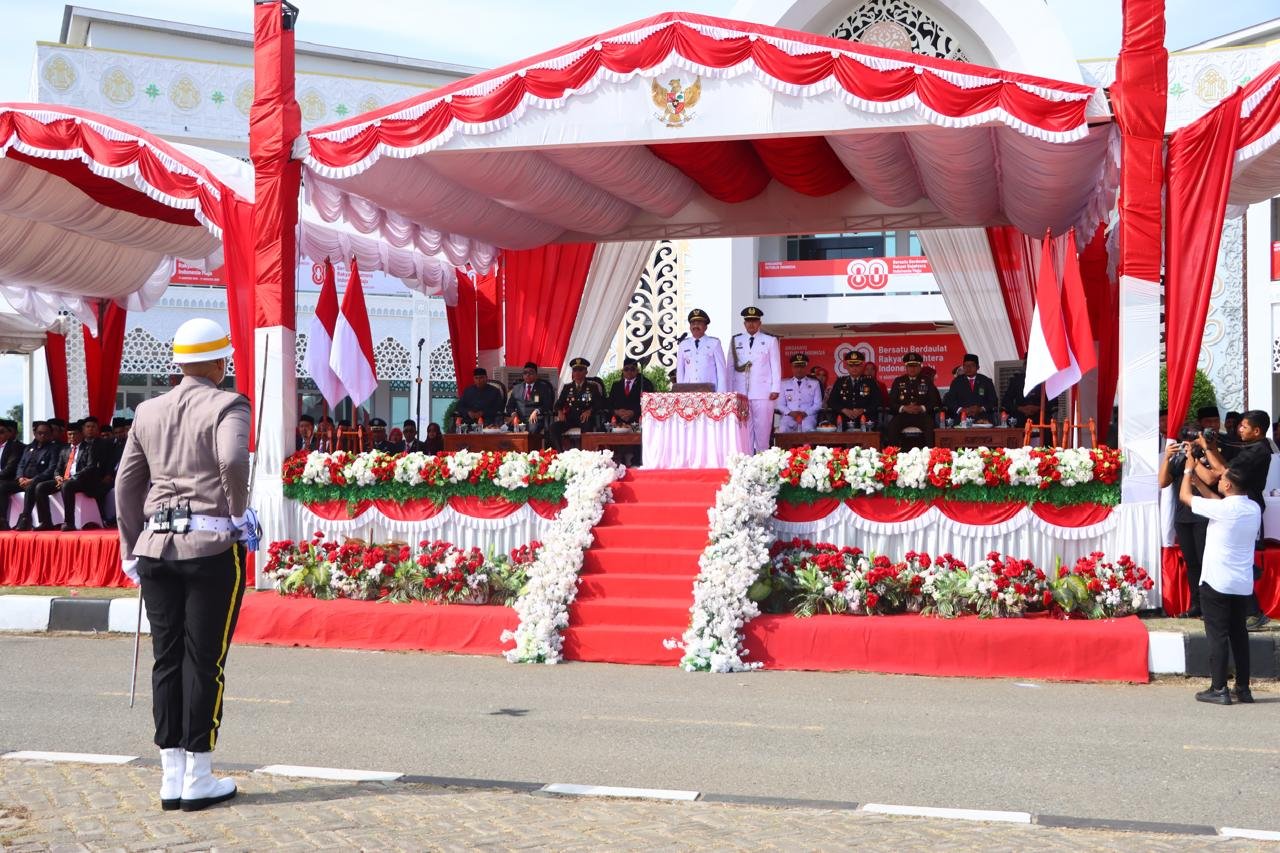 Sigli – Kapolres Pidie AKBP Jaka Mulyana, SIK, MIK. bersama Ketua Bhayangkari Cabang Pidie Ny. Ruri Jaka menghadiri upacara peringatan Hari Ulang Tahun ke-80 Republik Indonesia yang berlangsung khidmat di Lapangan Pidie Convention Center (PCC) Sigli, Minggu (17/8/2025).