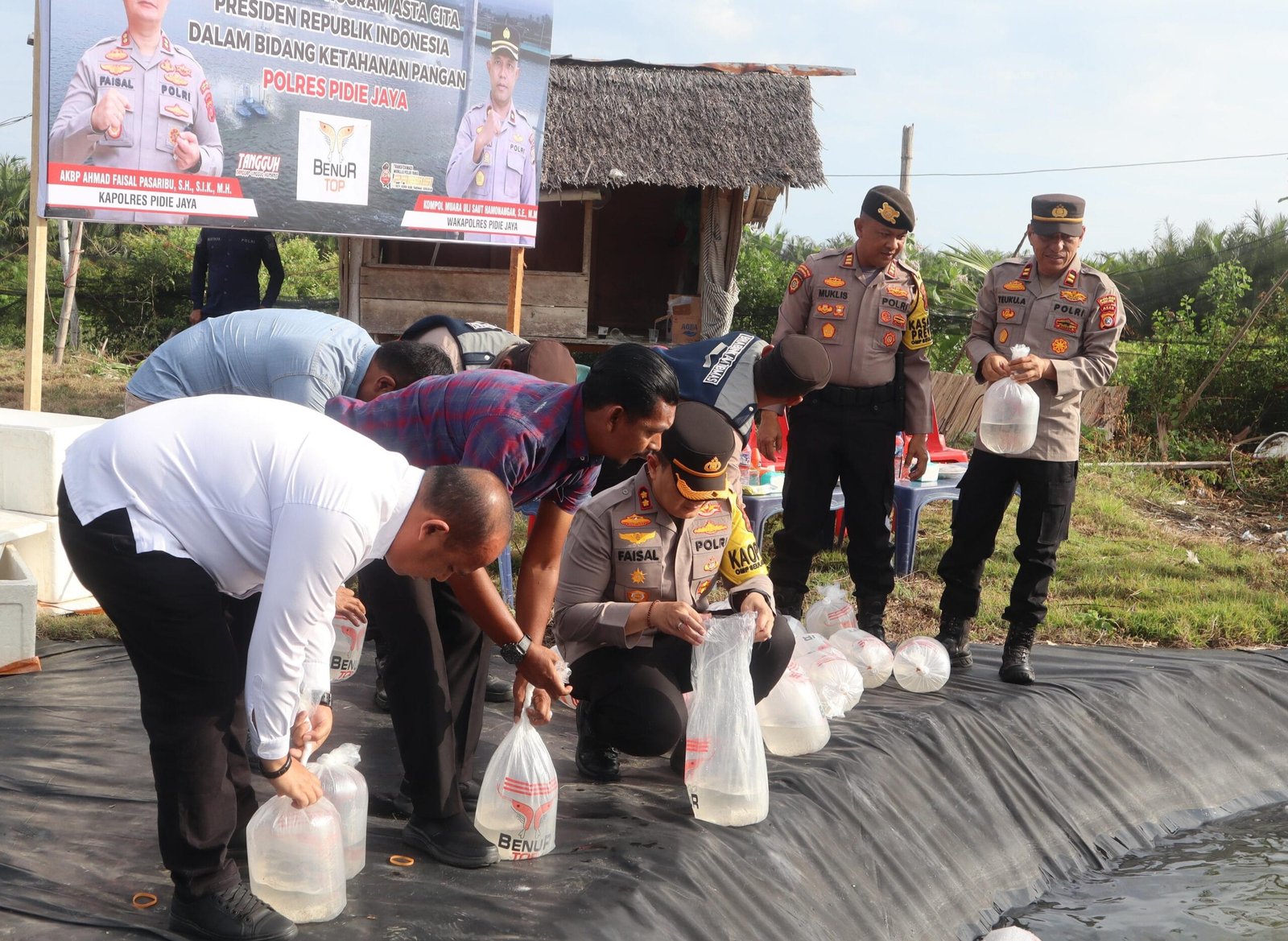 Pidie Jaya – Sebagai bentuk dukungan terhadap program Asta Cita Presiden RI dalam meningkatkan ketahanan pangan, Kapolres Pidie Jaya AKBP Ahmad Faisal Pasaribu, S.H., S.I.K., M.H., memimpin kegiatan penaburan 350.000 benur udang vaname di tambak milik personel Polres, Bripka Faisal.