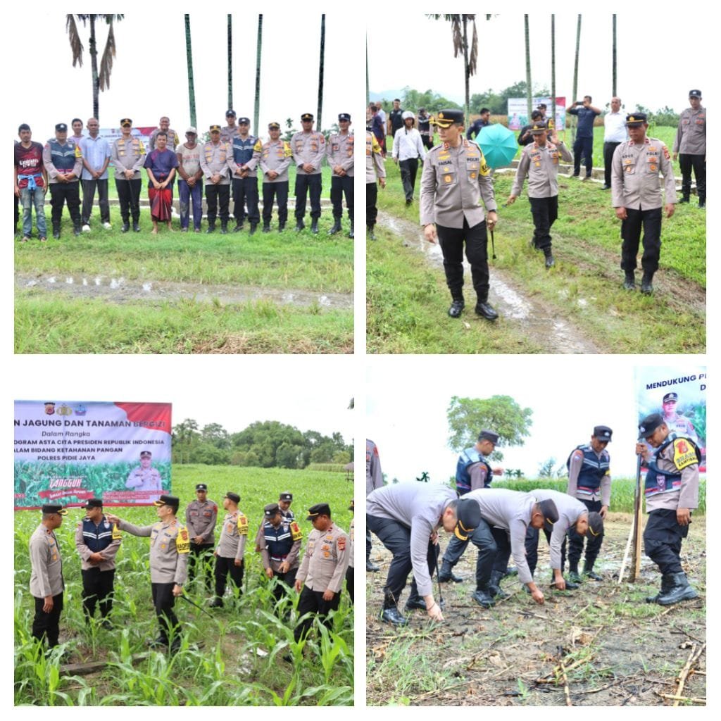 Pidie Jaya – Sebagai bagian dari komitmen mendukung program 100 Hari Kerja Presiden RI (Asta Cita) yang fokus pada ketahanan pangan, Kapolres Pidie Jaya, AKBP Ahmad Faisal Pasaribu, S.H., S.I.K., M.H., bersama jajaran Pejabat Utama (PJU) Polres Pidie Jaya, melaksanakan kegiatan penanaman, peninjauan, dan panen jagung serta tanaman bergizi lainnya di Gampong Pulo Gapu, Kecamatan Bandar Dua, Senin (11/11). Kegiatan ini berlangsung dari pukul 15.00 hingga 16.00 WIB dan dihadiri sejumlah pejabat Polres setempat.