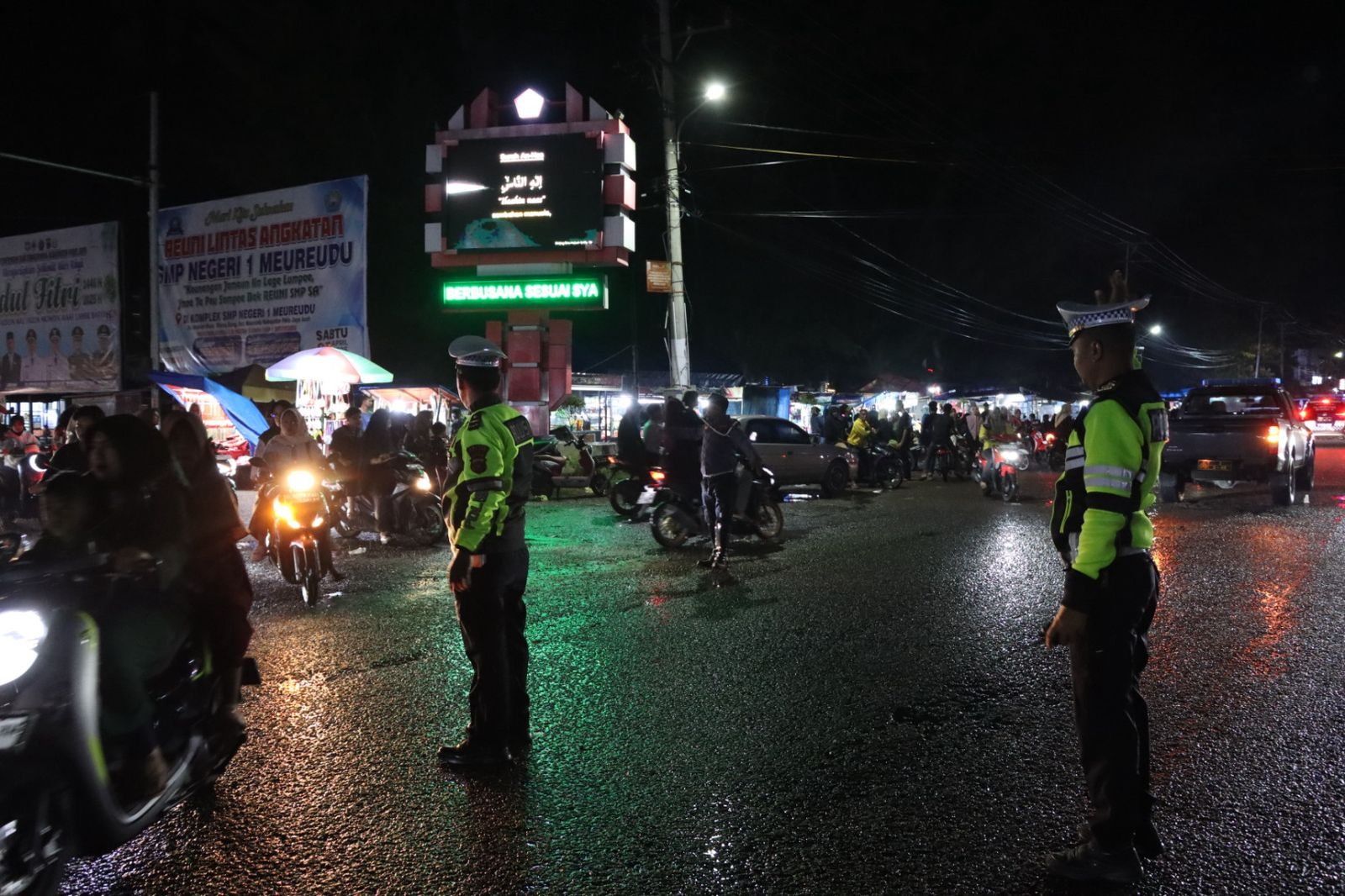 Personel Polres Pidie Jaya bersama Dinas Perhubungan dan Satpol PP turut dikerahkan untuk memastikan kelancaran dan keamanan jalannya pawai takbir keliling yang diikuti oleh masyarakat dari berbagai kecamatan.