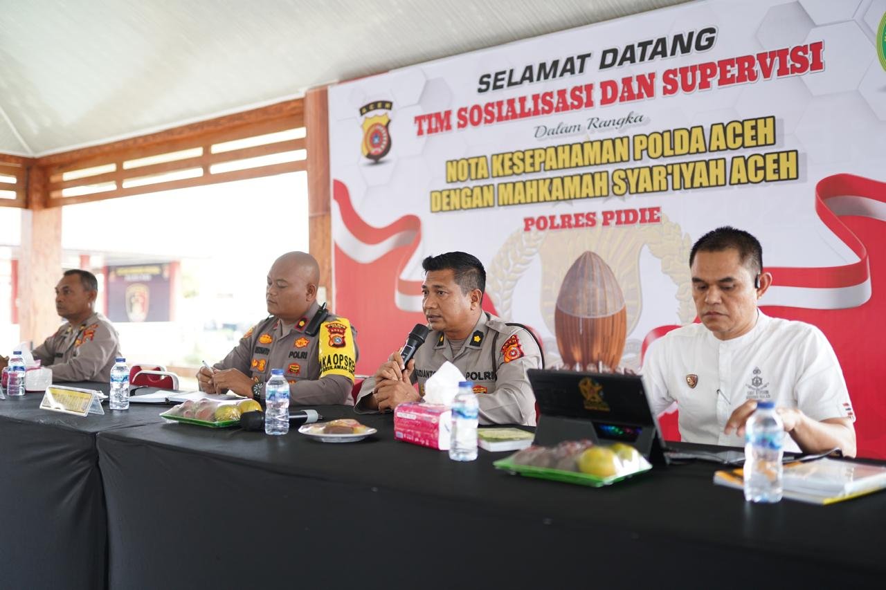 Sigli – Polres Pidie Mengikuti Sosialisasi dan Supervisi Nota Kesepahaman Antara Polda Aceh dengan Mahkamah Syariah yang dilaksanakan di Joglo Bhara Daksa Mapolres Pidie. Rabu (23/01/2025) sore.