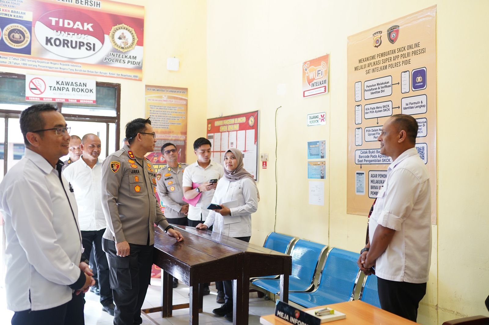 Dalam kunjungannya, Tim Verifikator melakukan pengecekan langsung terhadap sejumlah fasilitas pelayanan publik yang ada di Polres Pidie, antara lain ruang Sentra Pelayanan Kepolisian Terpadu (SPKT), pelayanan Surat Izin Mengemudi (SIM), ruang penerbitan SKCK, dan ruang Satuan Reserse Kriminal. Selain itu, tim juga meninjau berbagai sarana dan prasarana penunjang pelayanan seperti ruang tunggu, ketersediaan aksesibilitas bagi penyandang disabilitas, serta kelengkapan informasi layanan.