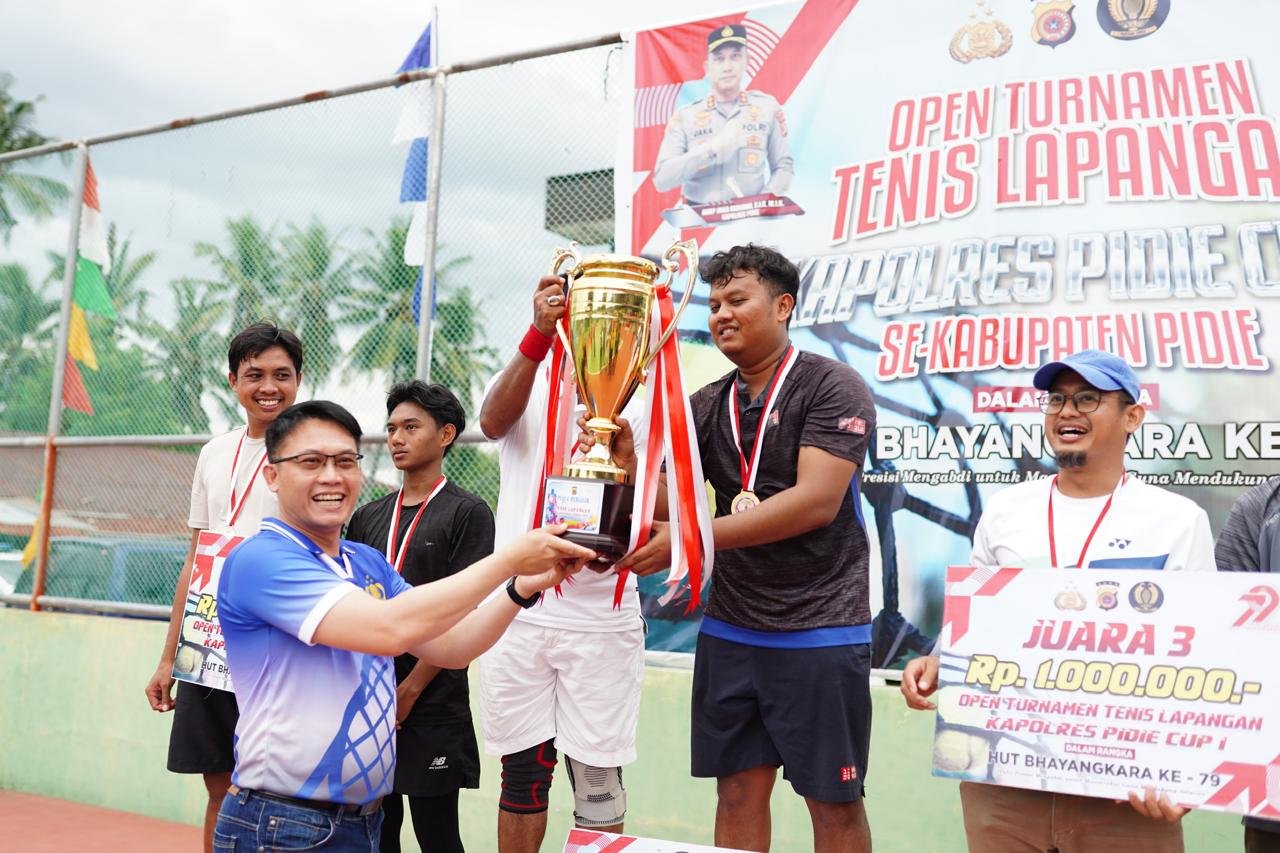 Sigli – Kapolres Pidie, AKBP Jaka Mulyana, SIK, MIK, secara resmi menutup turnamen Tenis Lapangan yang digelar dalam rangka memperingati Hari Bhayangkara ke-79, bertempat di Lapangan Tenis Baro Raya, Pidie, Minggu (22/6/2025).