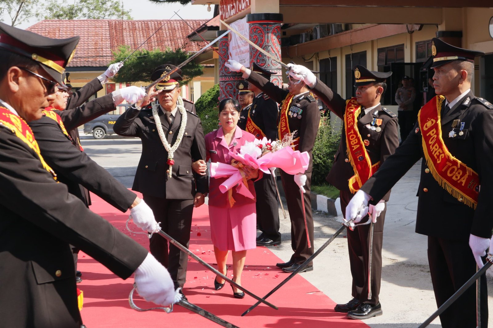 Dalam rangkaian upacara, Kapolres Toba AKBP Vinsensius Jimmy Parapaga S.I.K bertindak selaku Inspektur Upacara. Prosesi diawali dengan pembacaan keputusan purna bhakti, dilanjutkan penyerahan tanda kehormatan berupa Kep PDH dan keputusan pensiun kepada wisudawan sebagai bentuk apresiasi atas dedikasi dan pengabdian selama bertugas di institusi Kepolisian.
