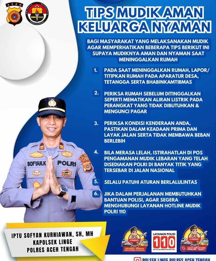 Namun, dalam perjalanan mudik, keamanan dan kenyamanan menjadi faktor utama yang perlu diperhatikan. Menyikapi hal ini, Kapolsek Linge, Iptu Sofyan Kurniawan, membagikan enam tips penting agar perjalanan mudik berlangsung aman dan nyaman: