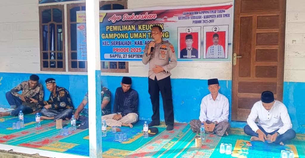Aceh Timur, Satupena.co.id– Kapospolsubsektor Lokop, Polsek Serbajadi, Polres Aceh Timur, Polda Aceh, Ipda Suhirman, S.H., bersama unsur Muspika Kecamatan Serbajadi memantau langsung jalannya proses pemilihan Geuchik Definitif Gampong Umah Taring, Sabtu (27/09/2025).