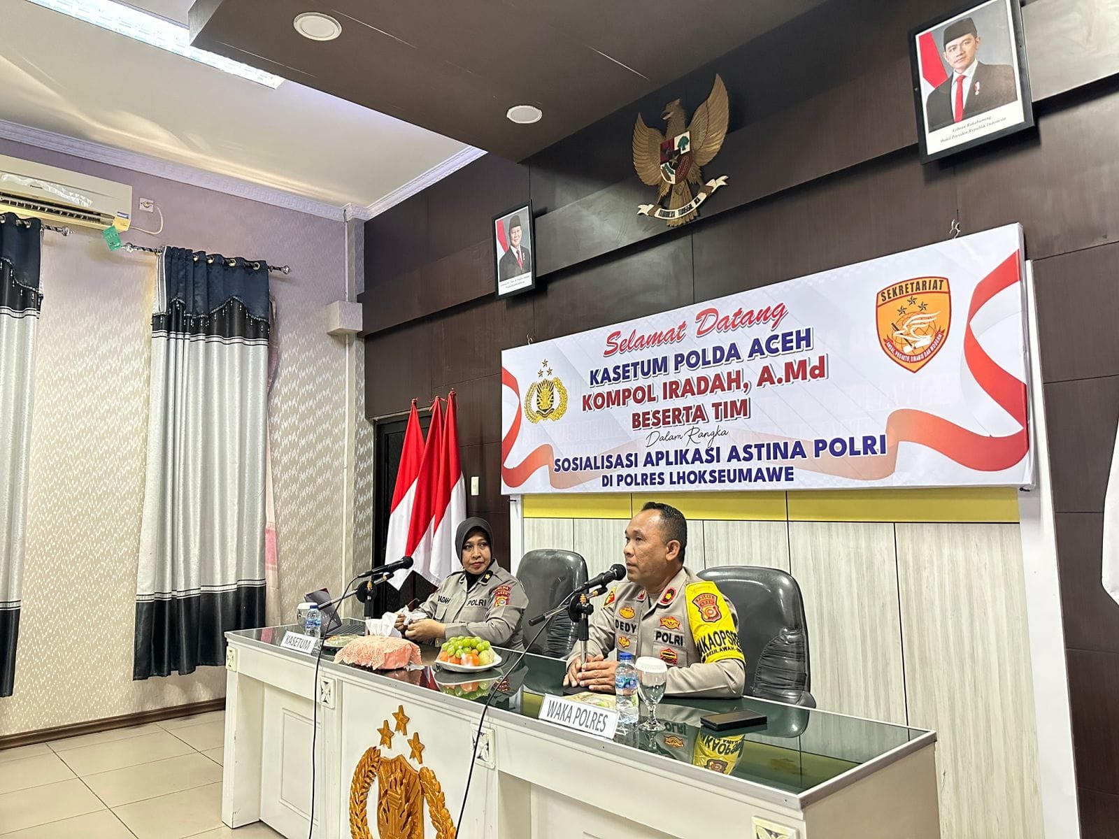 Lhokseumawe – Kasetum Polda Aceh, Kompol Iradah, A.Md, melakukan kunjungan ke Polres Lhokseumawe dalam rangka sosialisasi penggunaan Aplikasi Astina Polri bagi personel Polres Lhokseumawe. Kegiatan ini berlangsung di Aula Tribrata Polres Lhokseumawe pada Kamis (31/10/2024) pagi.