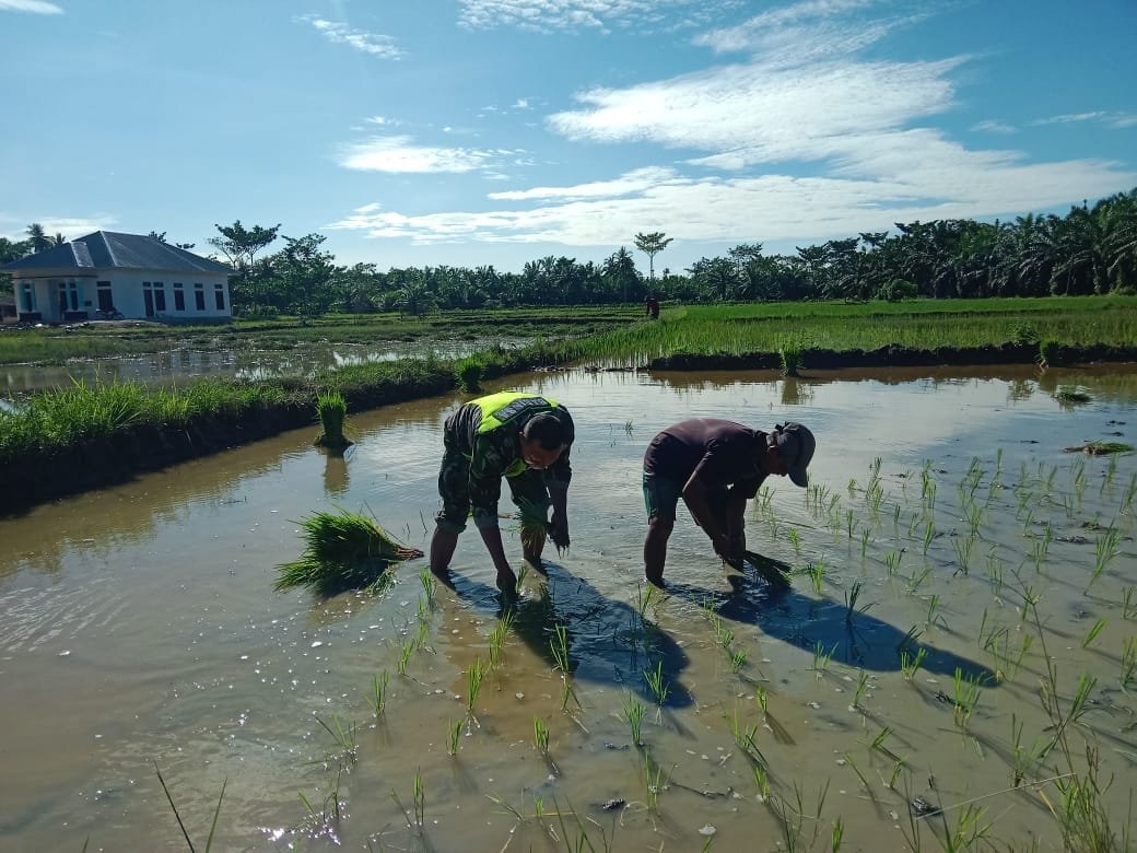 Babinsa Koramil 04/Bendahara Sertu Endri Syaputra mendampingi Petani menanam Padi milik bapak Tedi di Bandar Baru, Kecamatan Bendahara, Kabupaten Aceh Tamiang, pada Minggu (19/01/2025)