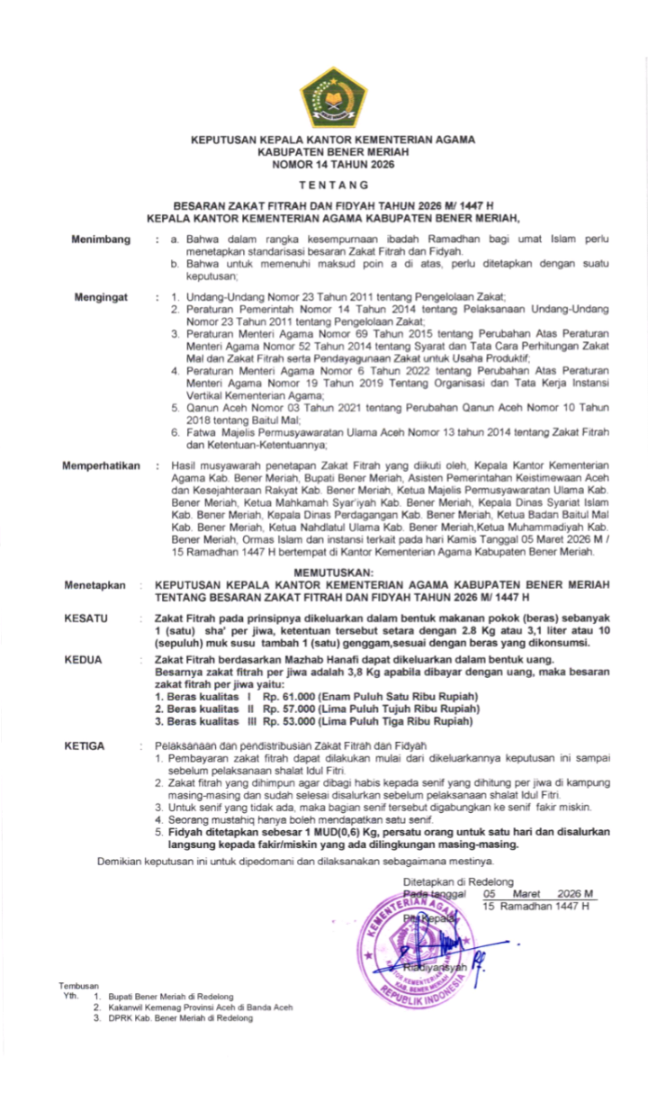 Bener Meriah –Satupena.co.id: Kantor Kementerian Agama Kabupaten Bener Meriah resmi menetapkan besaran zakat fitrah dan fidyah untuk tahun 1447 Hijriah/2026 Masehi. Penetapan tersebut tertuang dalam Keputusan Kepala Kantor Kementerian Agama Kabupaten Bener Meriah Nomor 14 Tahun 2026 tentang Besaran Zakat Fitrah dan Fidyah.