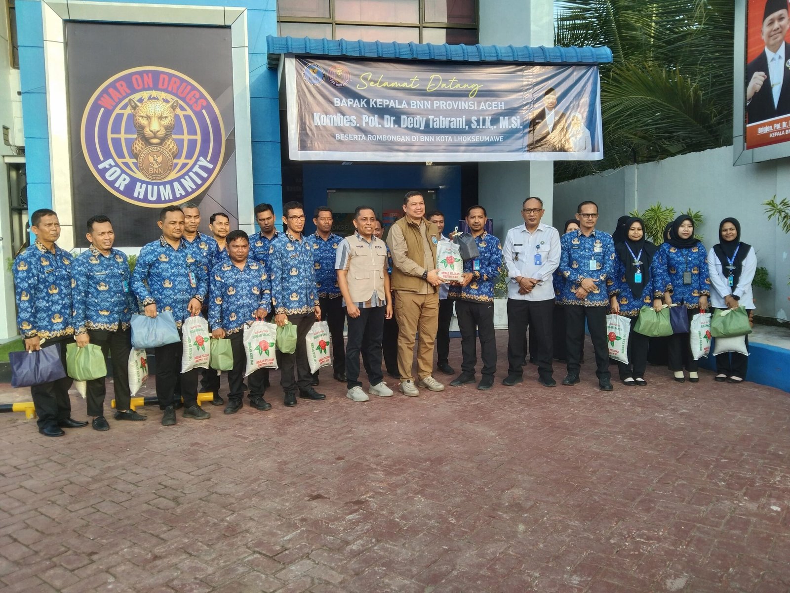 Lhokseumawe- Aceh. Satupena.co.id- Kepala Badan Narkotika Nasional Provinsi Aceh Kombes Pol Dr. Dedy Tabrani, SIK, M.Si melakukan kunjungan ke BNN daerah korban dan terdampak bencana banjir pada Senin (22/12/2025). Didampingi Kabag Umum dan sejumlah Pejabat Utama (PJU) BNNP Aceh, Kepala BNNP Aceh yang baru dilantik ini menyempatkan diri bersilaturrahmi dengan Kepala dan personil BNNK Lhokseumawe