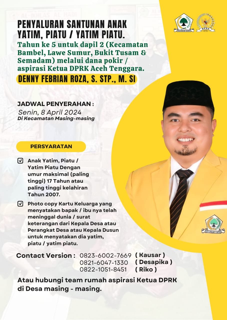 Denny Febrian Roza mengatakan, dalam beberapa hari ke depan, menjelang hari raya idul fitri 1445 H, anak-anak yatim yang berada di daerah pemilihan (Dapil) dua Aceh Tenggara, yakni meliputi Kecamatan Bambel, Bukit Tusam, Lawe Sumur dan Semadam bakal menerima santunan lewat program aspirasi dirinya.