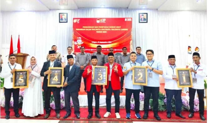 Kota Langsa- satupena.co.id:Komisi Independen Pemilihan (KIP) Kota Langsa menggelar rapat pleno terbuka untuk pengundian dan penetapan nomor urut calon Walikota dan Wakil Walikota dalam Pemilihan Kepala Daerah (Pilkada) 2024. Hasil pengundian menempatkan pasangan Said Madum Majid – Rusli (Tambi) pada nomor urut 1, Jeffri Sentana – Haikal Alfi Syahrin nomor urut 2, Maimul Mahdi– Nurzahri nomor urut 3, Sofyanto – Abdullah nomor urut 4, dan Fazlun Hasan – Meutia Apriani nomor urut 5.