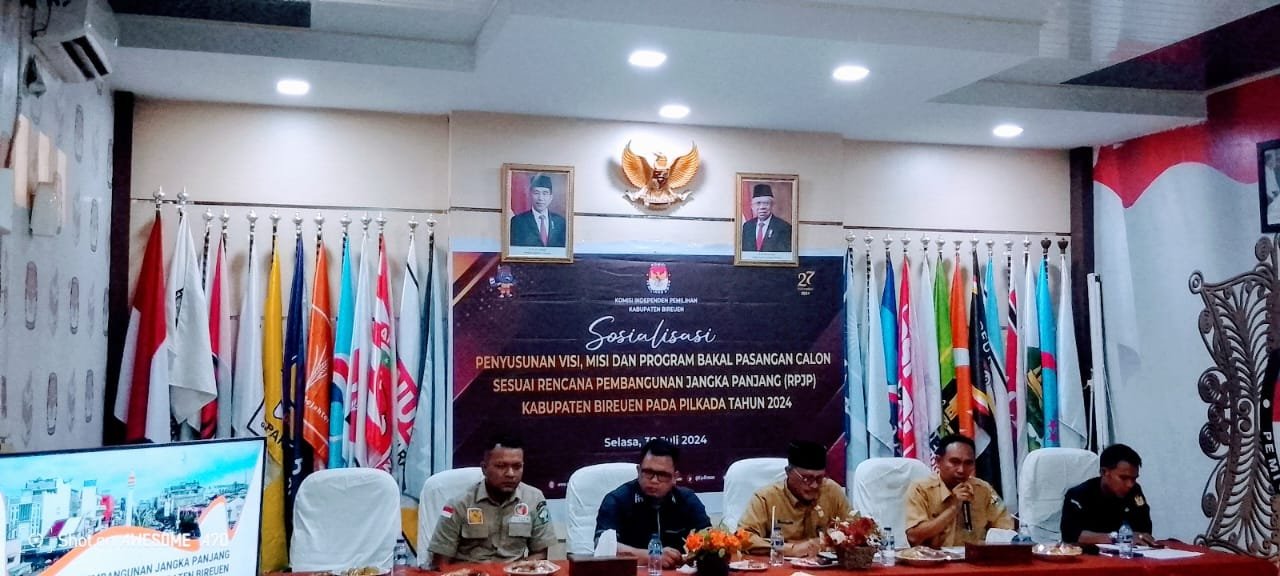 Komisi Pemilihan independen (KIP) Kabupaten Bireuen menggelar sosialisasi penyusunan visi, misi, dan program bagi bakal pasangan calon Bupati dan Wakil Bupati Kabupaten bireuen tahun 2024. Acara ini dihadiri oleh pengurus partai politik dan Pemerintahan Kabupaten Bireuen.