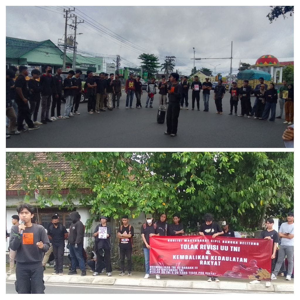 Pangkalpinang, Satupena.co.id. Koalisi masyarakat sipil di Bangka Belitung menggelar aksi demonstrasi besar-besaran di Jalan Raya Ayani, Pangkalpinang, pada Kamis siang (20/3/2025). Aksi ini merupakan bentuk penolakan terhadap revisi Undang-Undang Tentara Nasional Indonesia (UU TNI), yang dinilai berpotensi mengancam kedaulatan rakyat dan mengurangi peran sipil dalam proses politik di Indonesia.