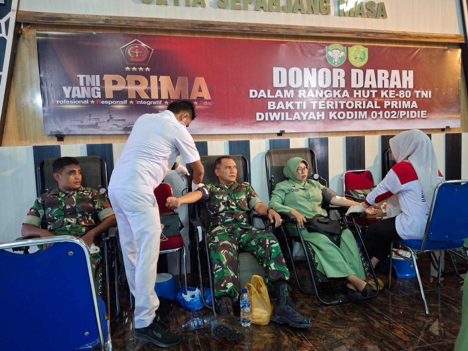 Pidie – Dalam rangka menyongsong Hari Ulang Tahun (HUT) Ke-80 Tentara Nasional Indonesia, Komando Distrik Militer (Kodim) 0102/Pidie menggelar aksi donor darah bekerja sama dengan PMI Kabupaten Pidie dan FKTP Yudha Bakti Polkes IM/09.01. Kegiatan ini berlangsung di Aula Yudha Makodim 0102/Pidie, Sabtu (20/9/2025).