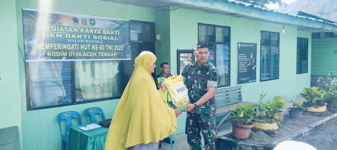 Aceh Tengah, Satupena.co.id.– Dalam rangka memperingati HUT TNI ke-80, Koramil 05/Linge, Kodim 0106/Aceh Tengah, melaksanakan kegiatan bakti sosial (baksos) dengan menyalurkan bantuan berupa 10 karung beras kepada masyarakat kurang mampu.