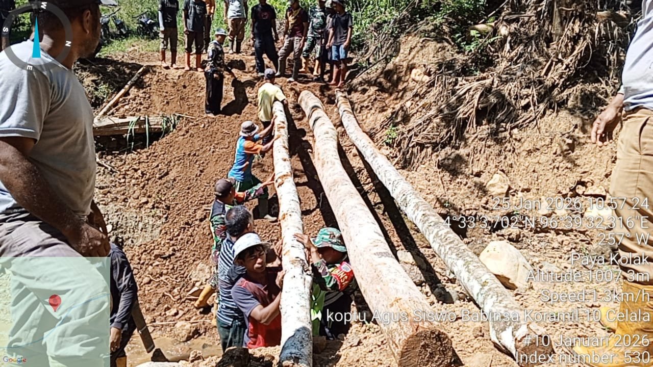 Aceh Tengah, Satupena.co.id – Anggota Koramil 10/Celala, Kodim 0106/Aceh Tengah, melaksanakan kegiatan gotong royong bersama masyarakat dalam pembuatan jembatan darurat serta pembersihan kiri dan kanan badan jalan akses menuju kebun warga di Simpang Kuwen, Dusun 10, Desa Paya Kolak, Kecamatan Celala, Minggu (25/01/2026).