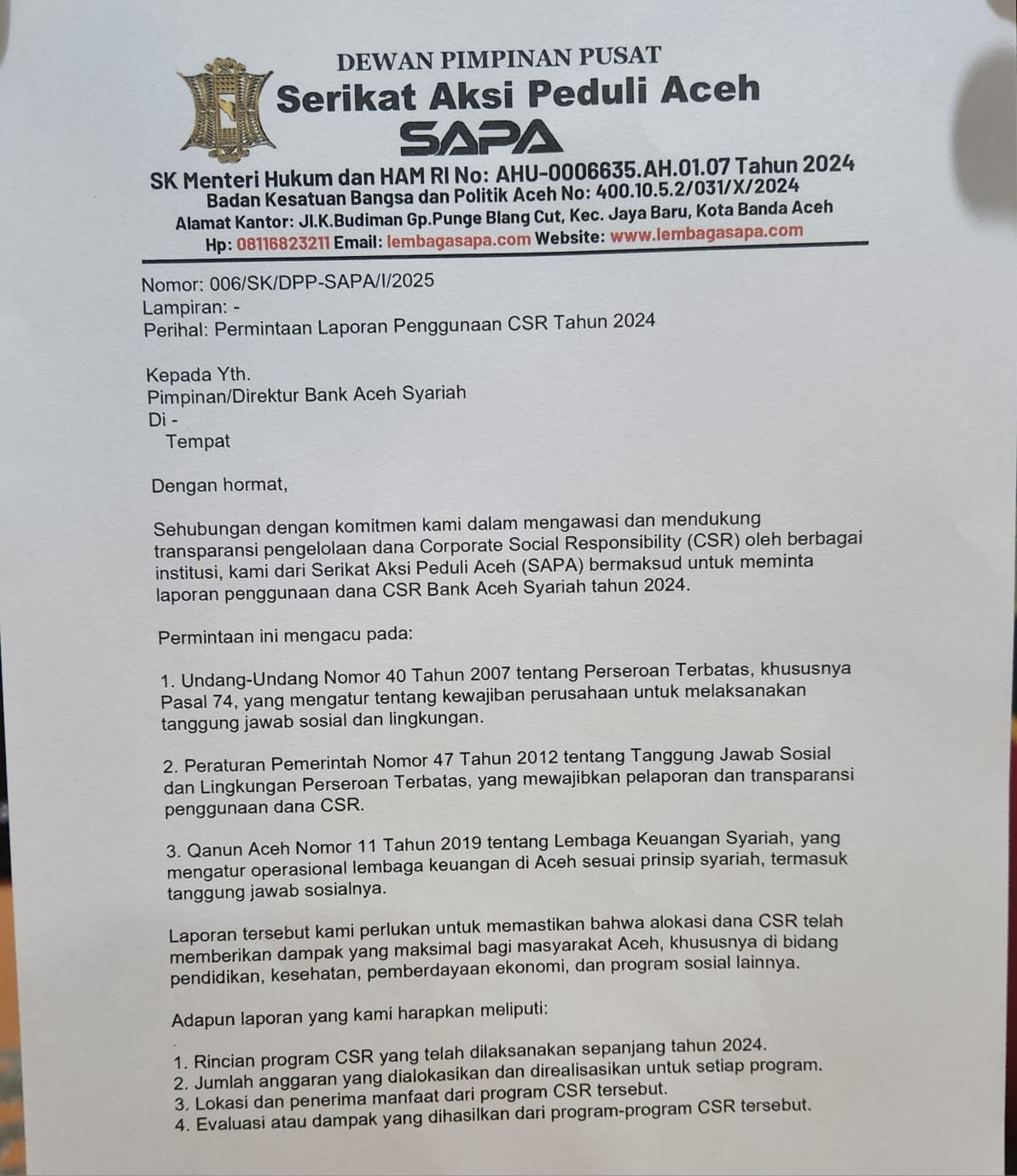 Aceh – Serikat Aksi Peduli Aceh (SAPA) resmi menyurati Bank Aceh Syariah untuk meminta laporan rinci penggunaan dana Corporate Social Responsibility (CSR) tahun 2024.