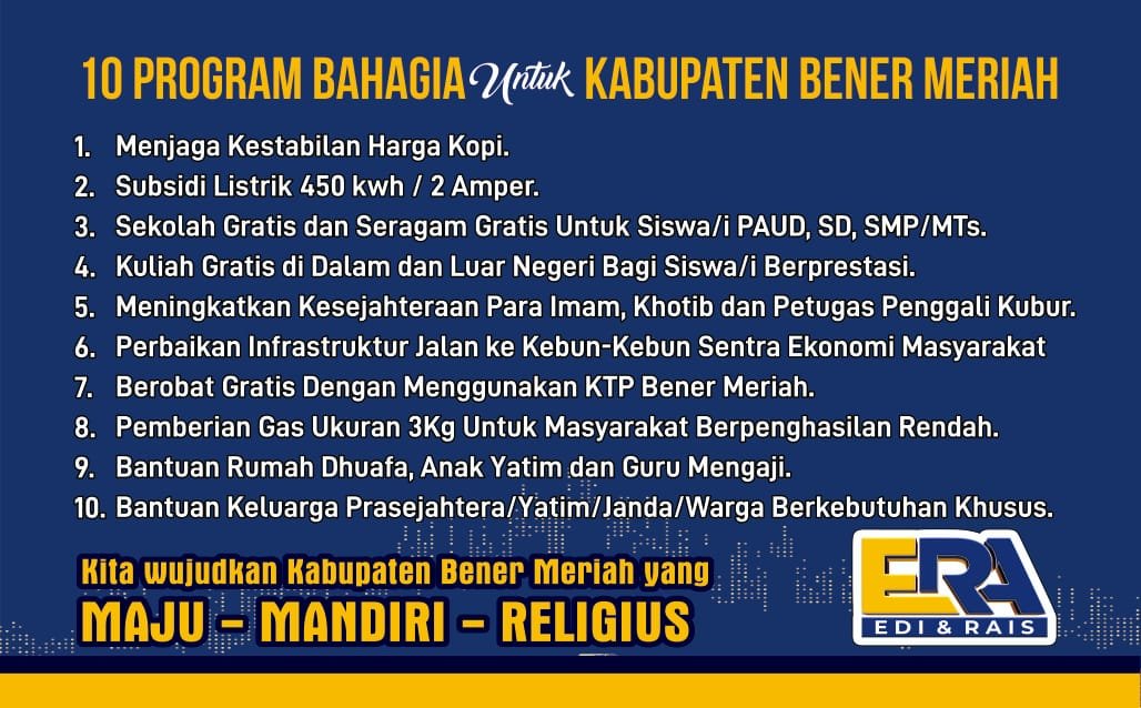 Visi: Terwujudnya Kabupaten Bener Meriah maju, mandiri, dan religius.