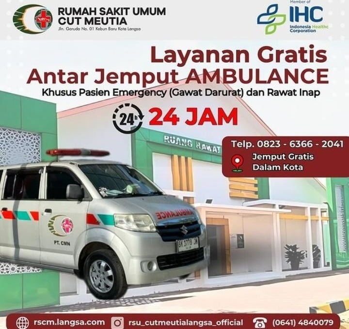 Langsa- satpena.co.id: Pelayanan Ambulance (gratis) jika di karenakan kondisi emergency menuju IGD RS Cut Mutia Medika Nusantara Kota Langsa, Ini merupakan trobosan yang sangat luar biasa dalam hal pelayanan,