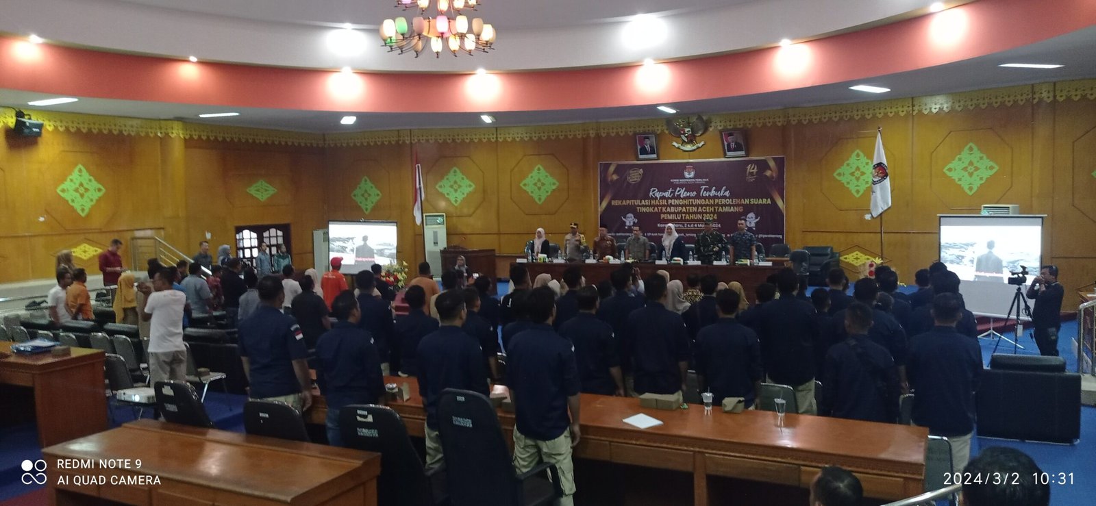Komisi Independen Pemilihan Kabupaten Aceh Tamiang menggelar Rapat Pleno Terbuka Rekapitulasi Hasil Penghitungan Perolehan Suara Tingkat Kabupaten Aceh Tamiang Pemilu Tahun 2024 di ruang sidang utama DPRK Aceh Tamiang, pada Sabtu, (02/03/2024).
