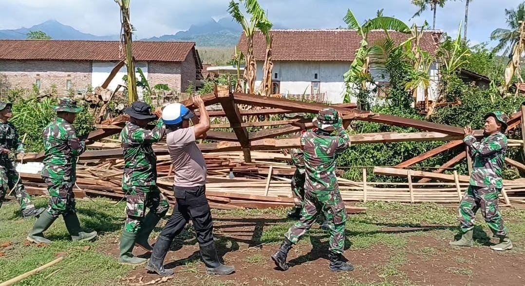 Tanpa rasa lelah membersihkan puing-puing reruntuhan sisa bangunan yang hancur, bersama Koptu Rusli anggota Koramil 0822/02 Curahdami Bondowoso.