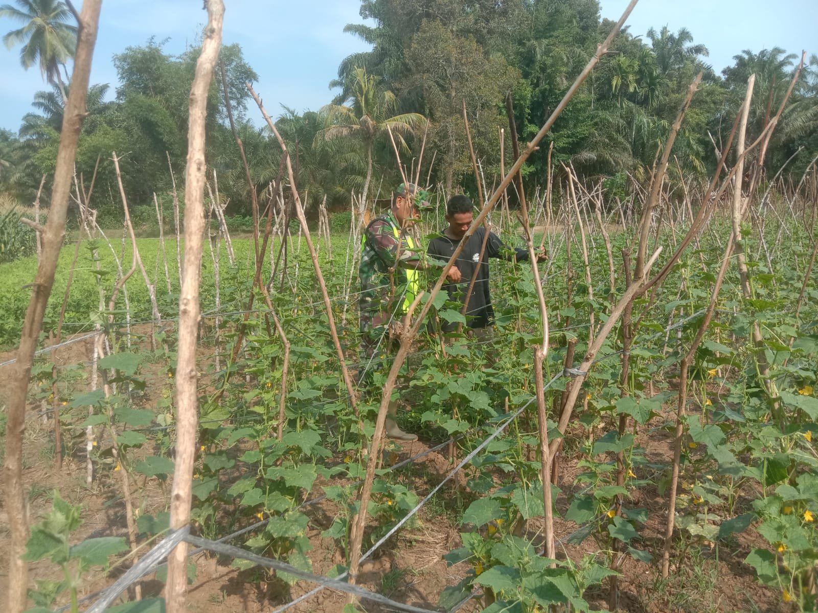Dalam melakukan giat pendampingan hanpangan (ketahanan pangan) terhadap para petani di wilayah binaannya, Babinsa Koramil 08/Rantau Serka Wakidi membantu petani merawat kebun sayur-sayuran berupa tanaman Timun di lahan seluas 0,20 Ha di Desa Sukarakyat, Kecamatan Rantau, Kabupaten Aceh Tamiang. Senin (13/05/2024)