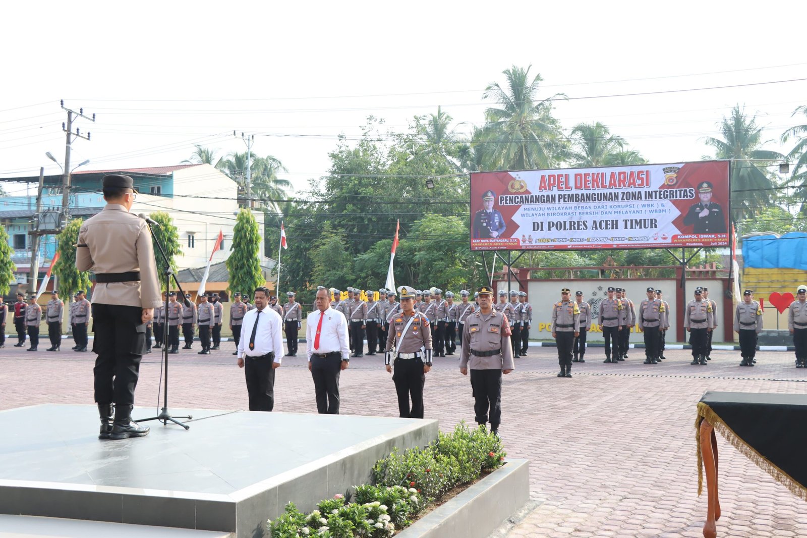 Dalam kesempatan tersebut Kapolres membacakan deklarasi yang diikuti oleh seluruh peserta apel dengan menyatakan; “Kami seluruh anggota Kepolisian Resor Aceh Timur melakukan pencanangan Zona Integritas menuju Wilayah Bebas Korupsi dan Wilayah Birokrasi Bersih Dan Melayani pada Satuan Kerja Kepolisian Resor Aceh Timur.
