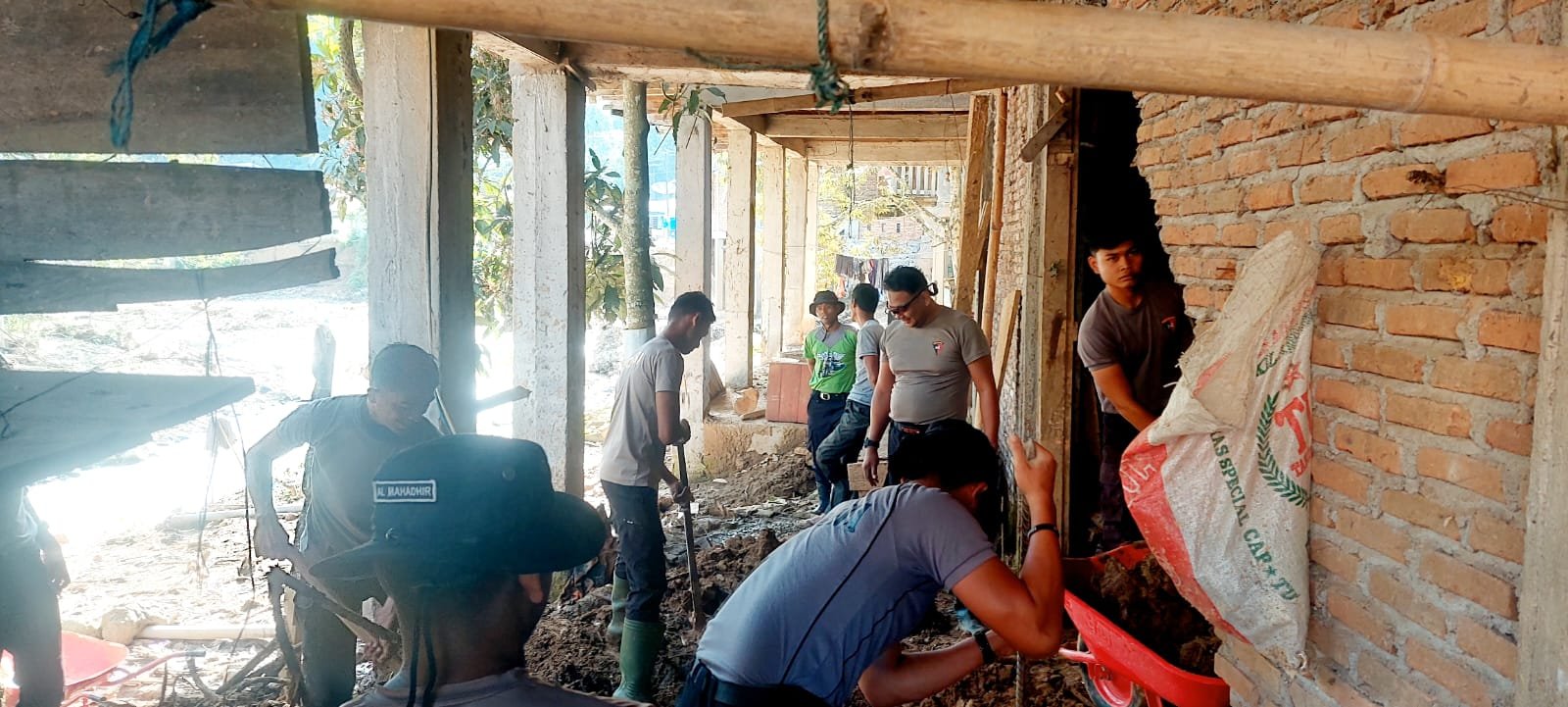 Sebanyak 20 personel gabungan dari Polsubsektor Rusip Antara dan BKO Brimob Polda Aceh diterjunkan untuk membantu proses pembersihan. Dengan menggunakan peralatan manual, para personel bahu-membahu mengangkat tanah dan kayu yang mengendap di bagian belakang rumah.