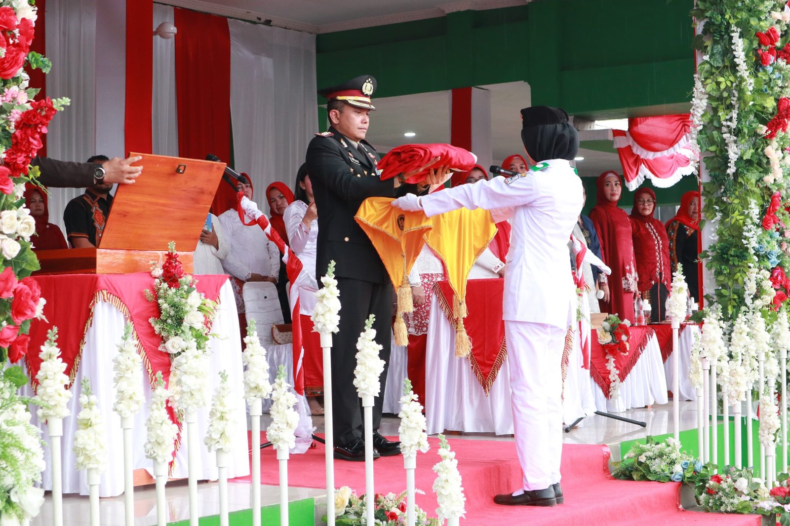 Kapolres Aceh Tenggara AKBP. R Doni Sumarsono, saat menerima Bendera Merah Putih dari Paskibraka