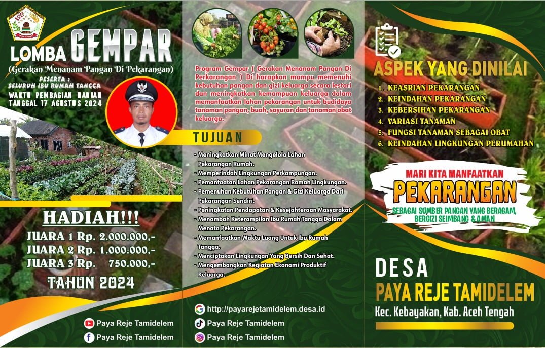 Guna untuk mendukung gerakan menanam di pekarangan rumah, Kepala Desa Paya Reje Tamidelem membuat program yang di singkat dengan lomba gempar yaitu lomba gerakan menanam pangan di pekarangan dengan membagikan berbagai macam benih diantaranya bawang merah, cabe, terong, tomat, brokoli, kol bunga, kol, sawi, sawi botol, bayam, kangkung, seledri, kacang panjang, kacang buncis, jagung dan mentimun. Sebagai sarana pendukung juga dibagikan pot, polibag dan pupuk kompos.