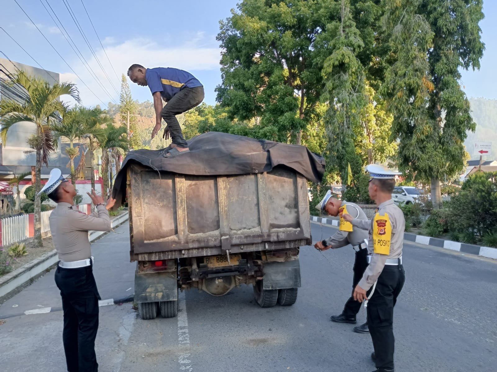 Muatan tidak di tutup terpal, sopir dump truk mendapat teguran dari Polisi Lalu Lintas (Polantas) Polres Aceh Tengah, Pada Selasa 6 Agustus 2024 di Jln. Yossudarso depan Mapolres setempat.