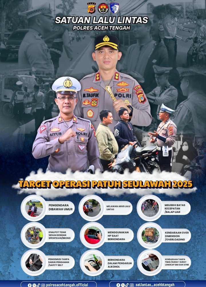 Polres Aceh Tengah melalui Satuan Lalu Lintas akan menggelar Operasi Patuh Seulawah 2025 mulai Senin, 14 Juli hingga 27 Juli 2025.