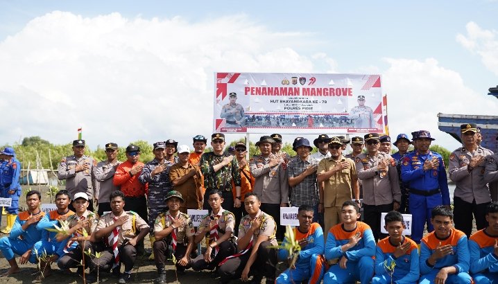 Sigli – Dalam rangka memperingati Hari Bhayangkara ke-79 tahun 2025, Polres Pidie bersama stakeholde pemerintah Kabupaten Pidie dan masyarakat melakukan penanaman bibit pohon Mangrove di kawasan pesisir pantai tepatnya di Gampong Pasi Peukan Baro Kecamatan Kota Sigli, Kabupaten Pidie, Senin (23/06/2025) sore.