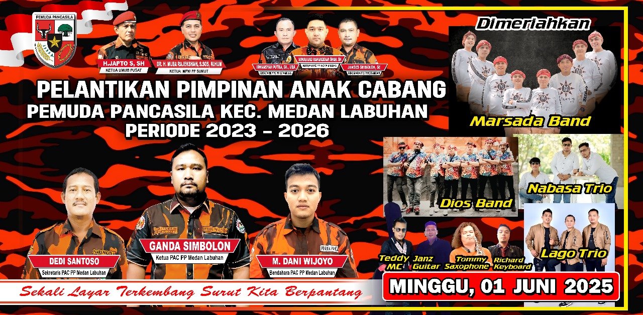 Kepengurusan Pimpinan Anak Cabang Pemuda Pancasila (PAC PP) Kecamatan Medan Labuhan Masa Bakti 2023–2026 akan resmi dilantik pada Sabtu, 1 Juni 2025. Acara pelantikan akan berlangsung di Kantor Sekretariat PAC PP di Jalan Yos Sudarso, Kecamatan Medan Labuhan, Kota Medan.