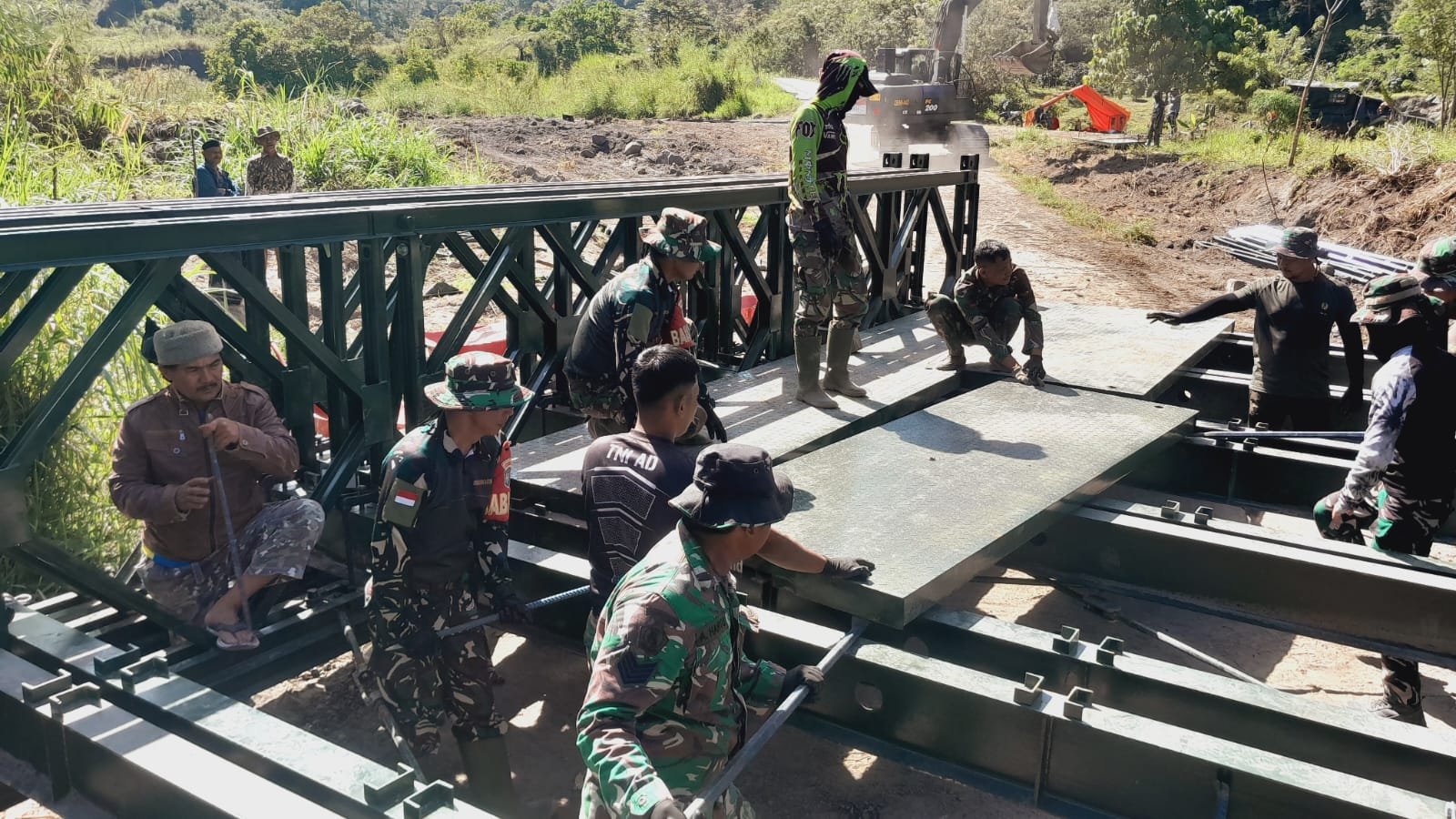 Pada tahap pekerjaan saat ini, personel di lapangan tengah melaksanakan kegiatan perakitan lantai jembatan Bailey sebagai bagian dari proses konstruksi menuju penyelesaian akhir.
